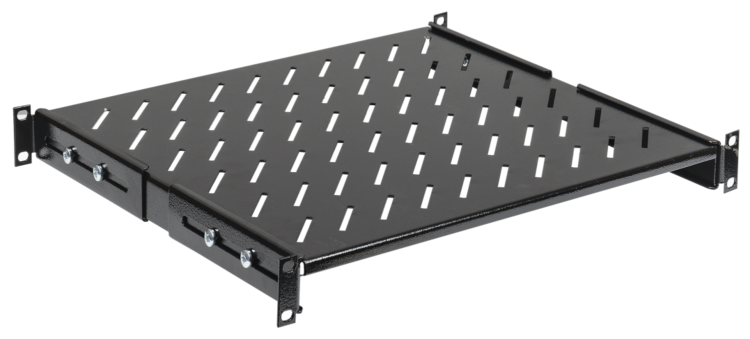 Стационарные полки рассчитаны на тяжелое оборудование с постоянным статичным размещением, крепятся как на фронтальные, так и на задние профили, имеют перфорированную поверхность для обеспечения лучшего охлаждения и отведения теплых воздушных потоков. Ушки, с помощью которых полки крепятся к монтажным профилям, могут регулироваться спереди и сзади в пределах 50 мм, что позволяет увеличить глубину полки на 100 мм и упрощает ее установку внутри шкафа.